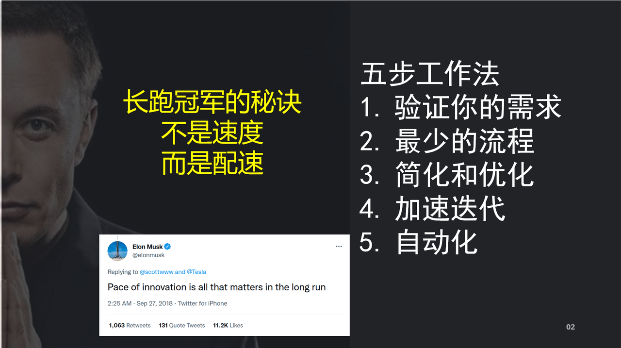 五步工作法在马斯克经历特斯拉Model3汽车的量产地狱(Mass Production Hell)以后痛定思痛,从很多管理失误和错误种总结出来的一套非常有效的企业商业创新管理思路。,指出顺序也不可错乱,因为我本人也经常做IT项目的需求分析,感觉有很大启发,IT行业很多时候的需求并不是做的太少,绝大部分失败的原因在于做的太多,没有关注用户的核心诉求,没有关键的功能点,贪大求全,而导致了失败,这个在很多失败产品上都能看见端倪,相反很多成功产品都是一句话能够说明白的,比如滴滴是打车的,微信是社交聊天的,抖音是make your day,美团是即使零售等等,这里涉及到用户心智,产品定位,当然最重要的是产品设计理念的传达,就是经常说的少即是多(LESS IS MORE)。理解马斯克的成事方法论,理解并加以融会贯通,成为自己工作方法的一个重要的衡量标准,是一个很好的学习方法。